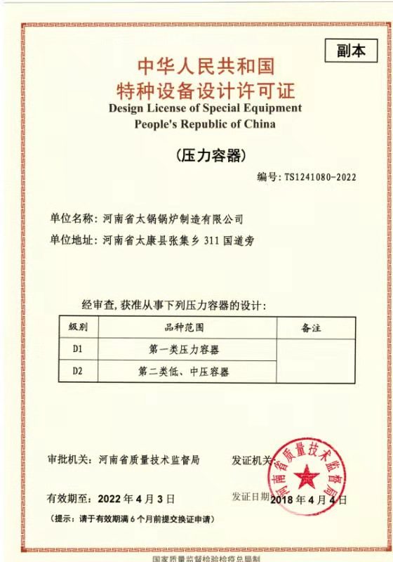 河南省太鍋鍋爐制造有限公司(原河南省太康鍋爐廠始建于1976年)始建于70年代初,經40多年的艱辛探索,靠科技興業,走科學管理之路,現已發展成為承接制造、安裝、設計大、中型供熱系統,生產:SZS燃油燃氣蒸汽鍋爐、燃煤蒸汽鍋爐、燃油鍋爐、燃氣鍋爐、電加熱鍋爐、生物質鍋爐、茶水鍋爐、有機熱載體鍋爐、熱風鍋爐,蒸壓釜、燃油蒸汽鍋爐、燃氣蒸汽鍋爐、燃油熱水鍋爐、燃氣熱水鍋爐并承擔安裝120噸熱水鍋爐、蒸汽鍋爐,生物質鍋爐,加工制造一、二類蒸壓釜、壓力容器,化工機械的省一級**企業。